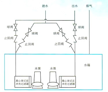 含有雜物的污水,由排水管線進入設備的污水流人口,再經過水箱內的過濾室將污水中所含雜物進行分離(雜物暫存于過濾室內),無雜物的污水流入水箱蓄水池。當蓄水池充滿后,控制系統自動啟動水泵,反方向向過濾器排水,由