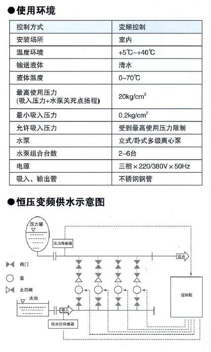 該恒壓變頻供水設備是由最新性能PID變頻控制柜和2臺以上水泵并聯組成的尖端加壓供水設備, 能夠自動調節以滿足用戶的恒壓變量供水要求。供水管網壓力保持恒定,整個供水系統始終保持高效節能的最佳狀態。供水方式有變頻供水和壓力供水兩種,變頻供水是自動調節某臺水泵的轉速或多臺水泵投入/退出運行,使供水管網壓力保持恒定的理想供水方式,操作簡單。